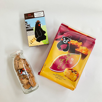 美味しくて見た目も可愛いお土産3種をセレクトしました。牧場こだわりの牛乳を使った「阿蘇の草原とぶ牛クッキー」、サクッとしっとり♪独特な食感が人気の「黒糖ドーナツ棒」、県産からいもを風味豊かに香ばしく焼き上げた「熊本焼すぃーとぽてと」。さぁ、どれが当たるかお楽しみに!(左から時計回り)